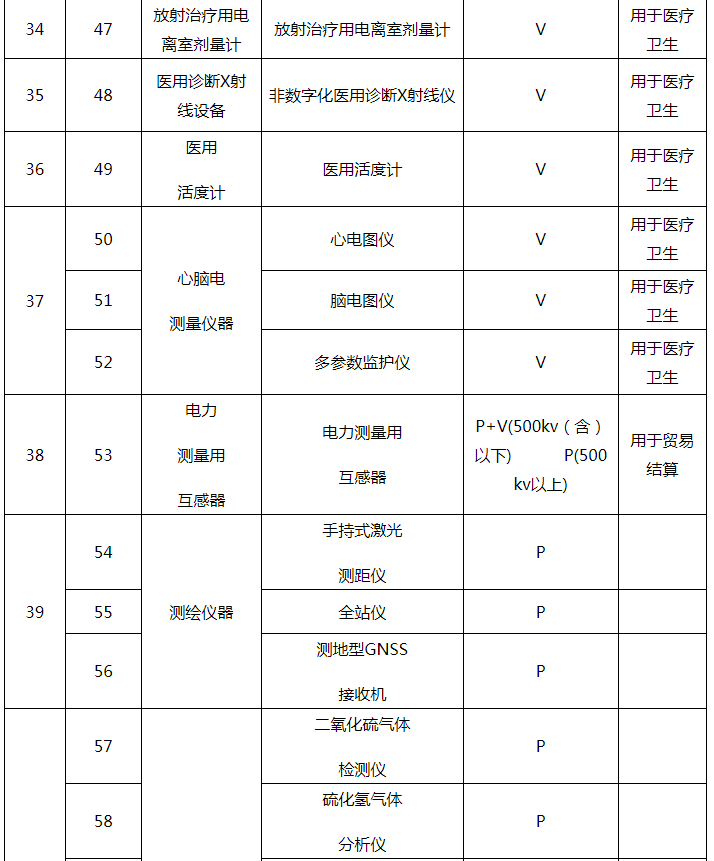 1 | 1 | 體溫計 | 體溫計 | P+V(其中玻璃體溫計只做型式批準(zhǔn)和首次強(qiáng)制檢定,失準(zhǔn)報廢) | 用于醫(yī)療衛(wèi)生 |