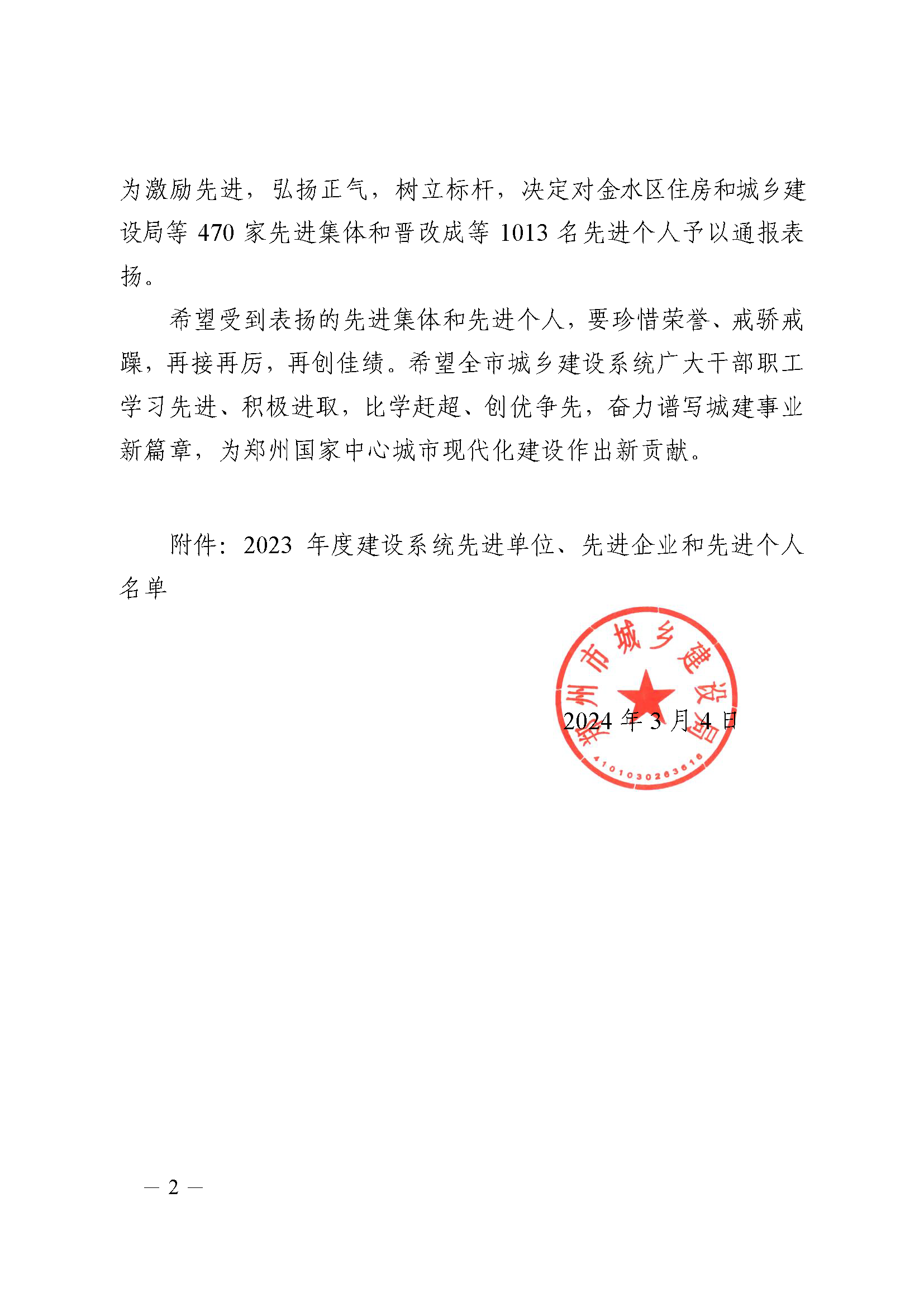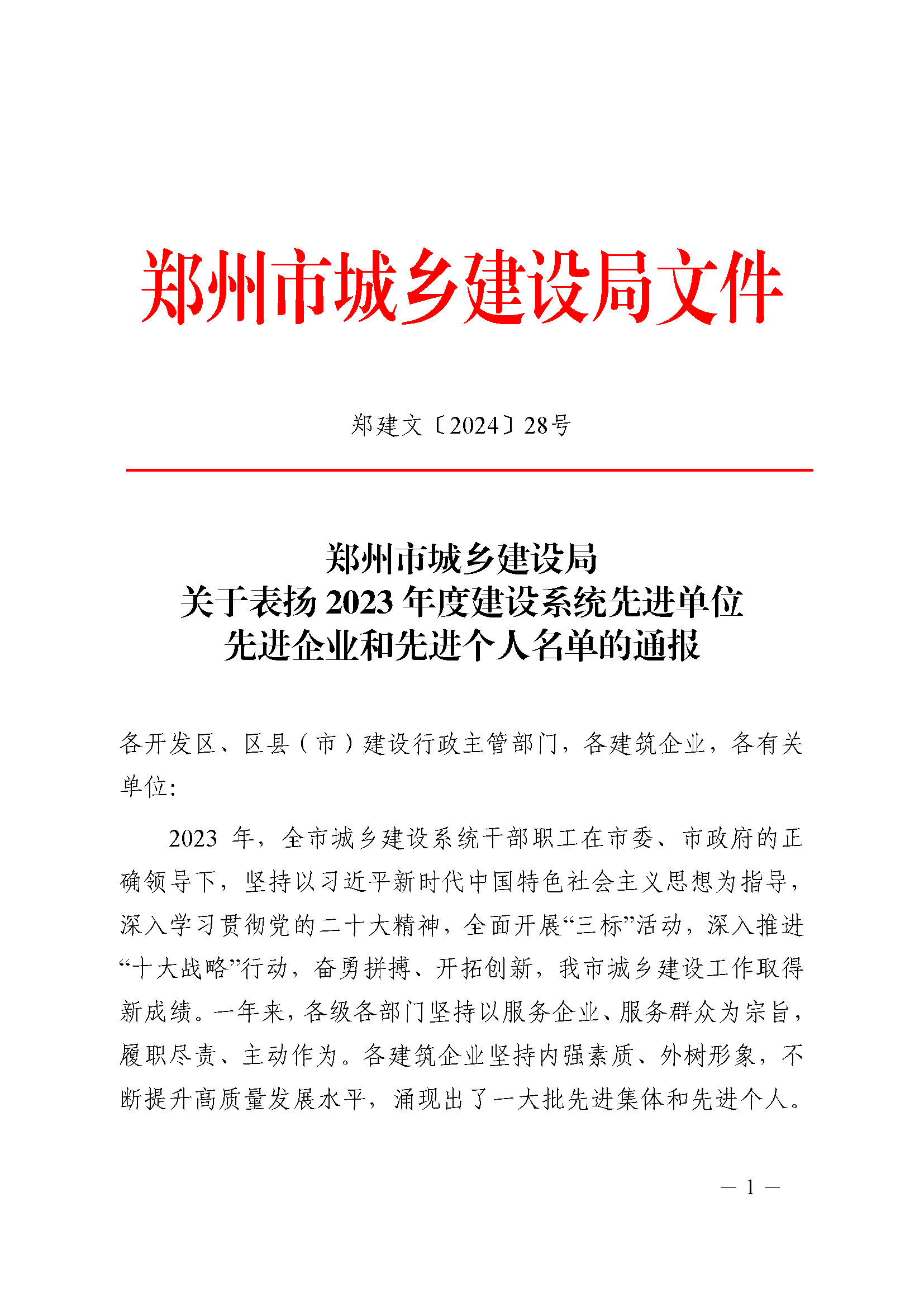 鄭州市城鄉(xiāng)建設(shè)局關(guān)于表揚(yáng)2023年度建設(shè)系統(tǒng)先進(jìn)單位先進(jìn)企業(yè)和先進(jìn)個(gè)人名單的通報(bào)